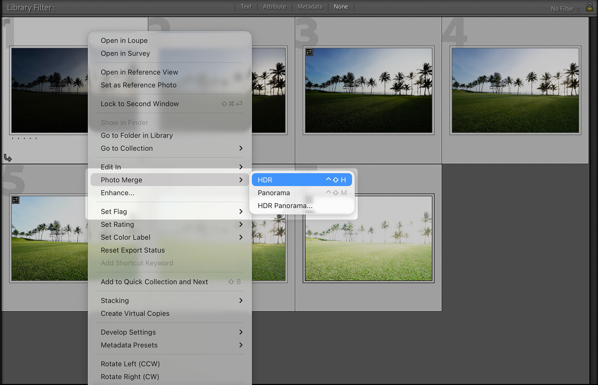 Second, right click on any one of the selected image and select Photo Merge > HDR